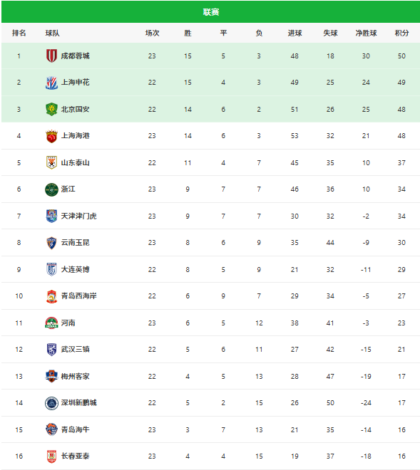 随着上述2场焦点战结束,中超积分榜第一名的位置再次换队:蓉城队以50分的积分,力压申花队1分,暂时升到第一名;而海港队已经落后2分;接下来的压力,给到申花队和国安队。